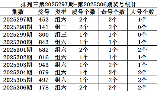 上期回顾:排列三第2025306期开奖:178,质合比为2:1,奇偶比为2:1,大小比为2:1。