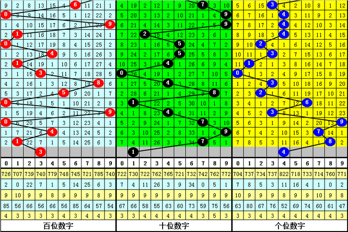 百位分析:该位上期奖号为1,出现1路、奇数、小 号,在前11期奖号,该位012路比为5:4:2,2路号码较少,目前012路号码遗漏期数分别为2、0和5,近期百位注意0路号码走热。